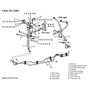 - Remove the plugs from the pump and injector ports. Install the fuel line