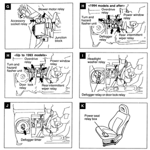Defogger Relay, and Rear Intermittent Wiper Relay: separate units mounted