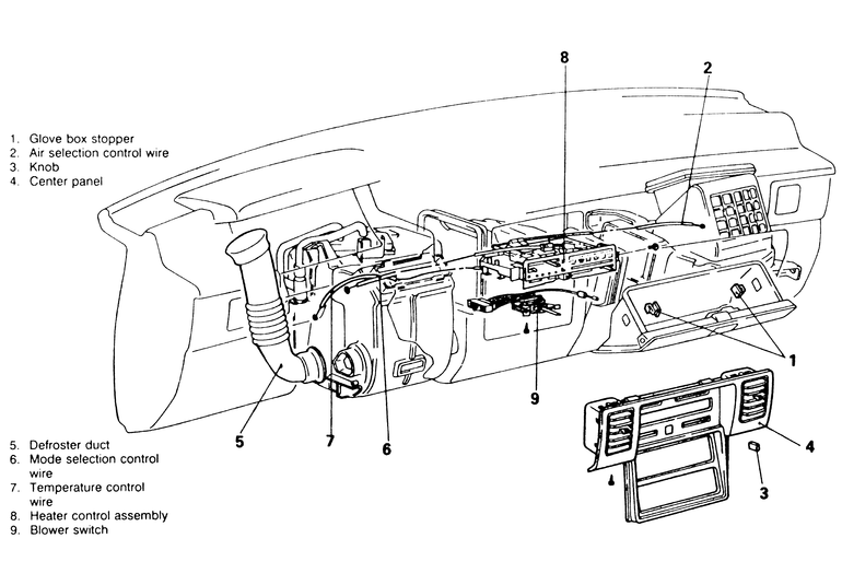 | Fig. 3: Heater control assembly removal and installation components — 1983–91 Monteros |
