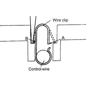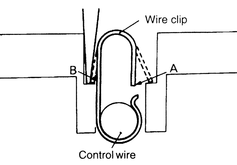 | Fig. 5: Use a prytool to push the wire clip in directions A and B to remove the three control cables — 1992–95 Monteros |