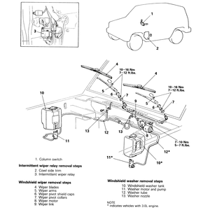 | Fig. 4: Windshield wiper and washer system components and their locations — 1987–91 Monteros |