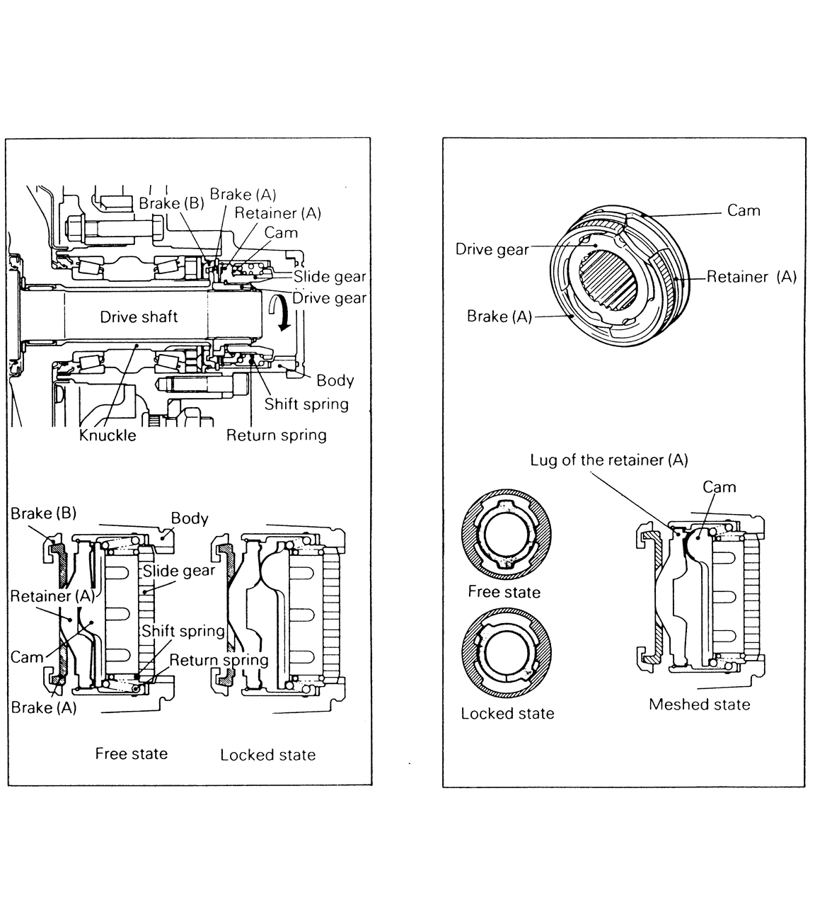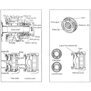Because brake (B) is secured to the knuckle, retainer (A) ceases to rotate, and therefore, the cam, while compressing the return spring, rises out of the cam groove of the retainer (A) and compresses the shift spring. The slide gear is pushed by the shift spring, and then engages with the gear of the housing when the two are in phase and enters the locked state.
