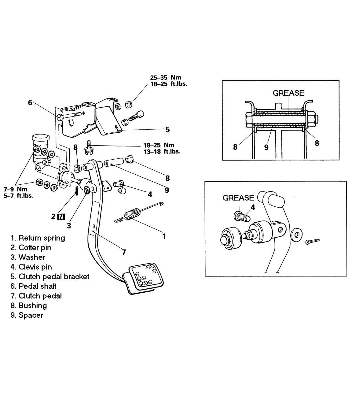 | Fig. 3: Clutch pedal removal and installation — 1989–90 Monteros equipped with 2.6L engines (earlier years with hydraulic clutches are similar) |