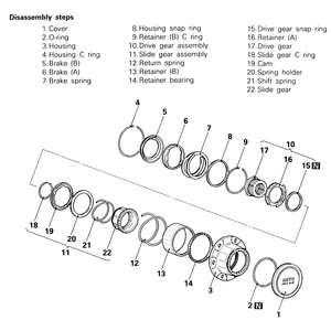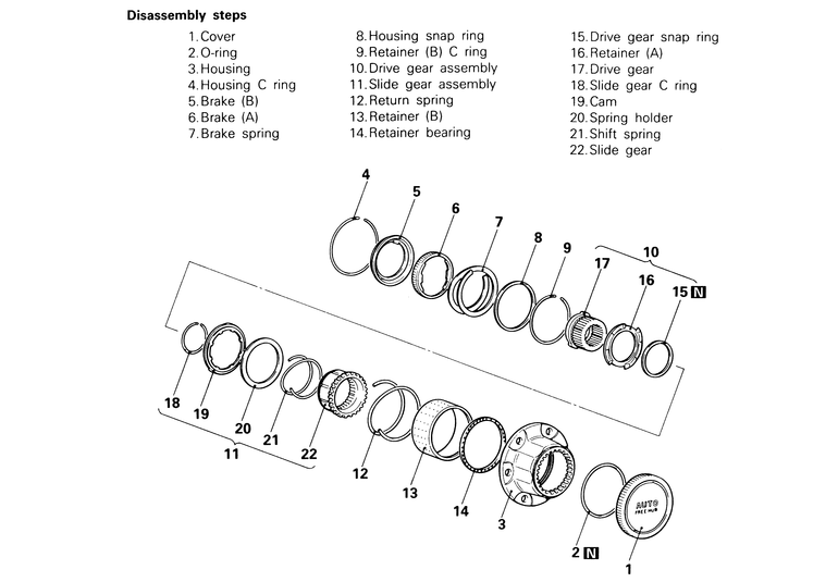 | Fig. 2: Automatic free-wheeling hub assembly disassembly and assembly components |