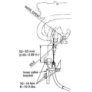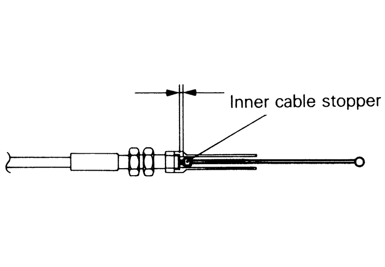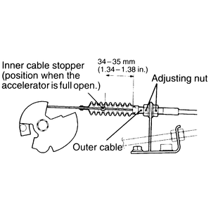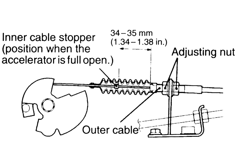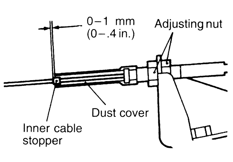 | Fig. 5: Move the inner cable stopper to change the clearance at idle — the clearance should be 0.8–1.5mm (0.031–0.05 in.) |