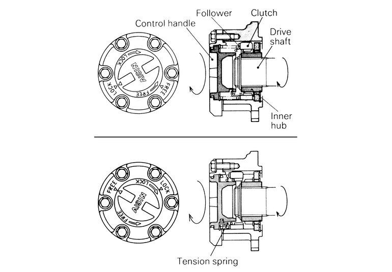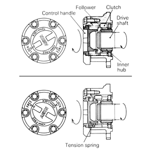 When the control handle is set to the FREE position, the follower moves along the oblique groove in the control handle and uses the tension spring to disengage the clutch from the splines of the ineer hub, thus separating the free-wheeling hub body from the driveshaft.