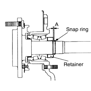 - Remove the snapring from the inside end of the axle shaft. Remove one retainer