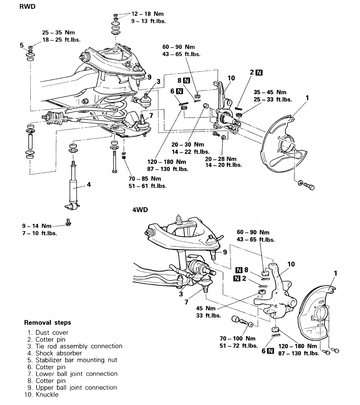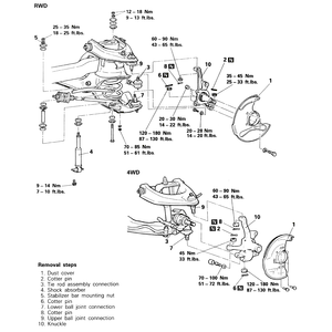 | Fig. 1: Front steering knuckle removal and installation components — 2WD and 4WD vehicles |