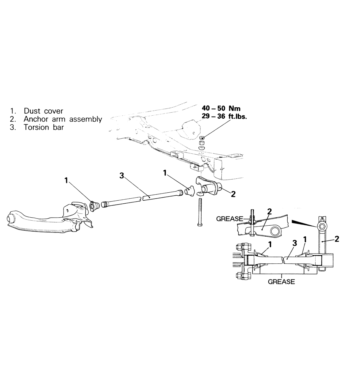 | Fig. 1: Front torsion bar removal and installation components — 4-wheel drive Pick-ups and Monteros |