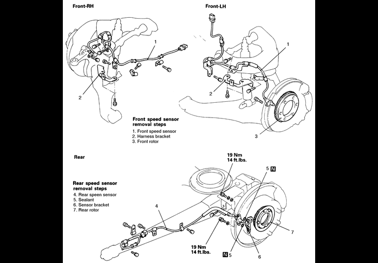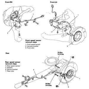 | Fig. 1: Wheel speed sensor removal and installation components — 1992–95 Monteros |