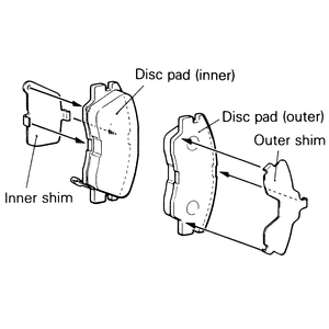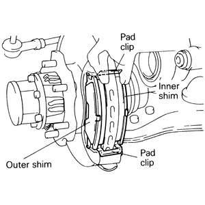 There are several combinations of shims, spacers and clips in use on Mitsubishi vehicles. When disassembling, work on one side at a time and pay attention to placement of these components. If you become confused during reassembly, refer to the other side for correct placement. To remove the brake pads: