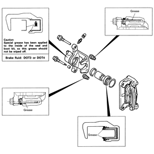 | Fig. 3: Rear brake caliper lubrication points for reassembly — 1992–95 Monteros |