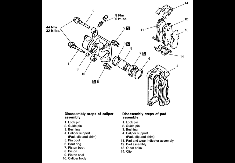 | Fig. 2: Rear brake caliper disassembly and reassembly components — 1992–95 Monteros |
