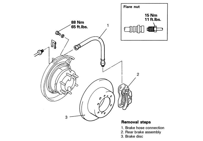 | Fig. 1: Rear disc brake caliper removal and installation components — 1992–95 Monteros |