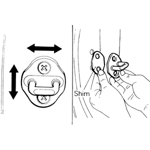 The position of the door can be adjusted in three dimensions: fore and aft, up and down, in and out. The primary adjusting points are the hinge-to-body bolts.