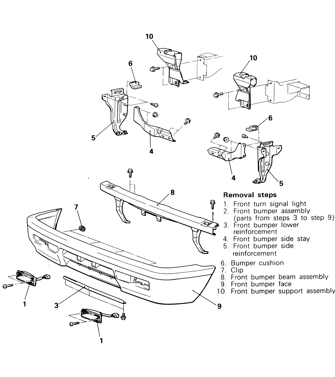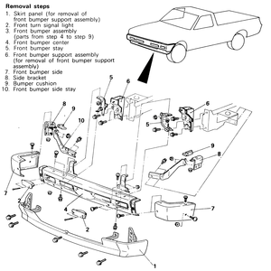 | Fig. 4: Front bumper removal and installation components — Monteros |