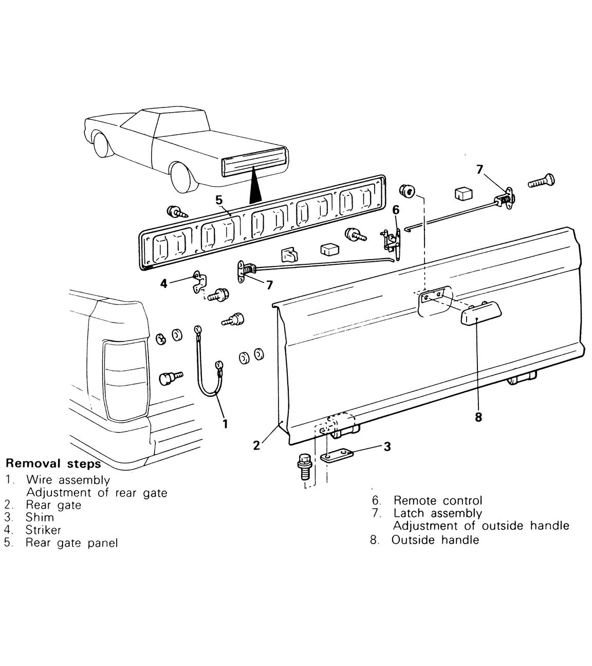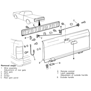 | Fig. 2: Rear tailgate assembly removal and installation components — Pick-ups |