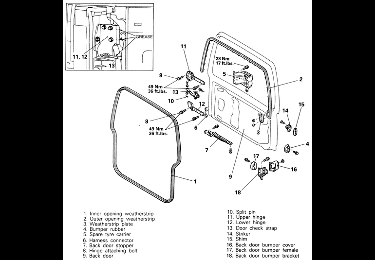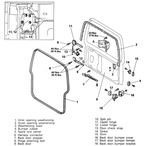 | Fig. 1: Back door assembly removal and installation components — Monteros |