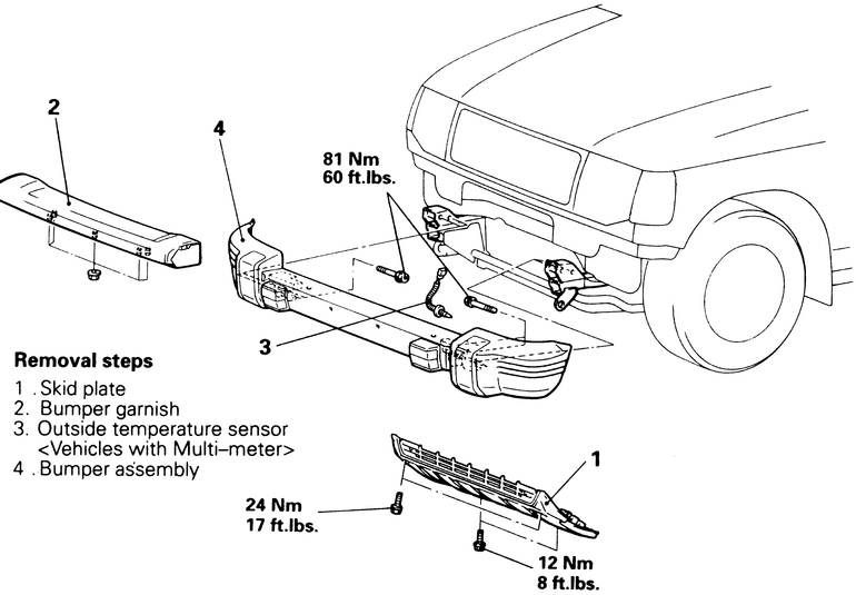 Straightforward and simple, the Montero bumpers are removed from either end by removing the 4 bolts holding the unit to the mounts. The rear bumper has 4 additional bolts — 2 at each side — at the leading edge of the bumper corner trim. Although the bumpers are simple to remove, they are still heavy; be careful!