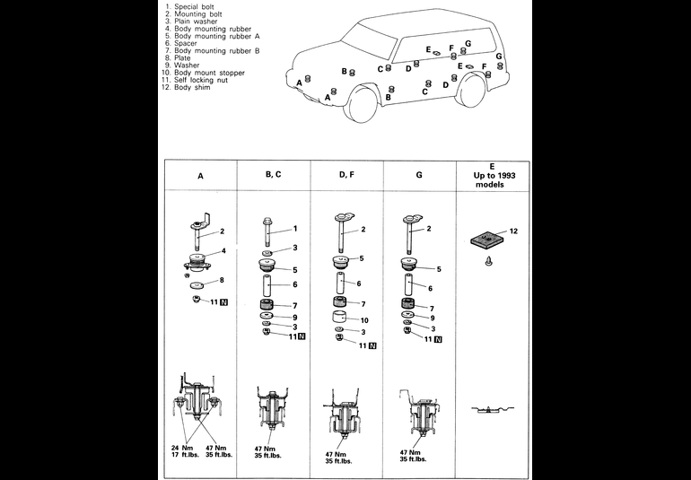 | Fig. 2: Body mounting positions and components — 1992–95