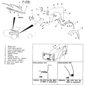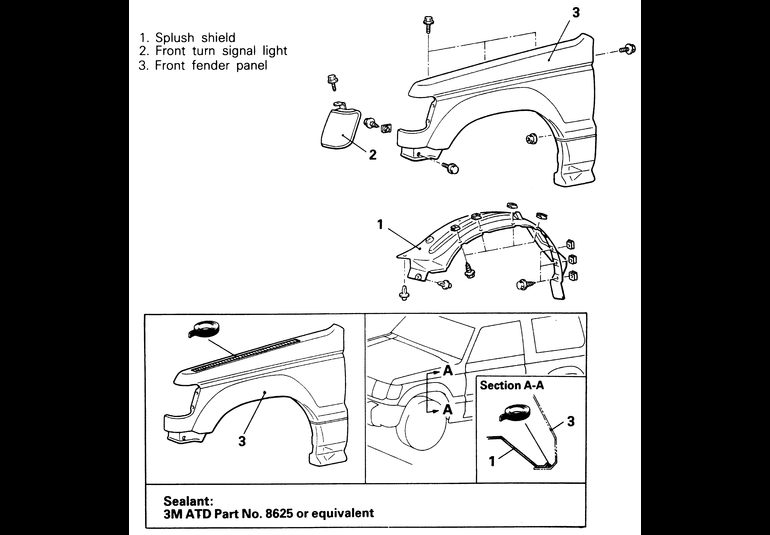 | Fig. 3: Front fender removal and installation components — 1983–91