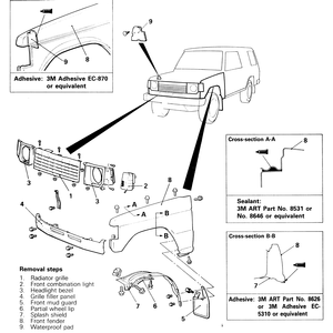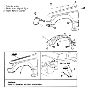 | Fig. 1: Front fender removal and installation components — 1983–95