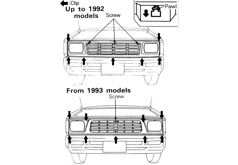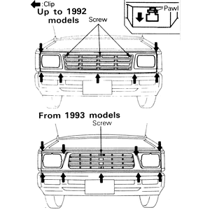 | Fig. 1: Make certain to detach all retaining screws and clips before removing the front grille from the vehicle |