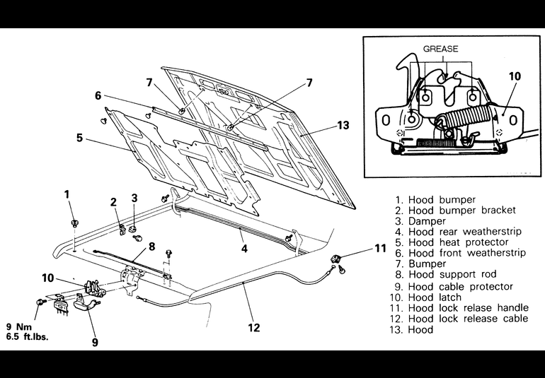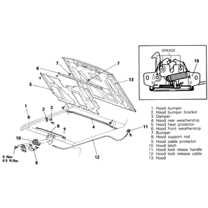 - Remove the hood assembly, lifting it off the hood prop. Place the hood out