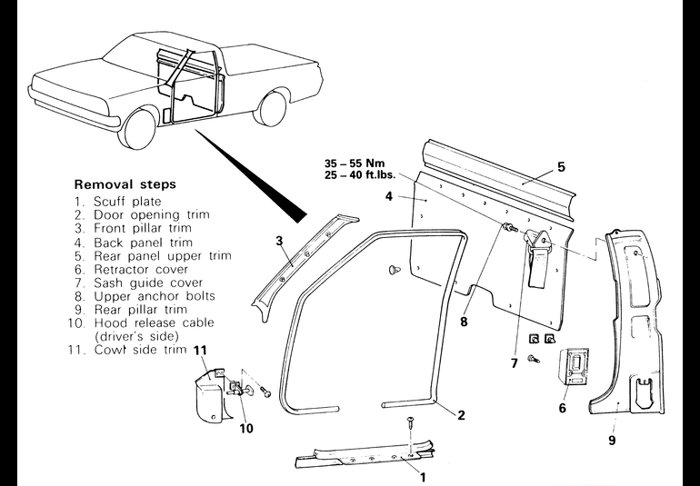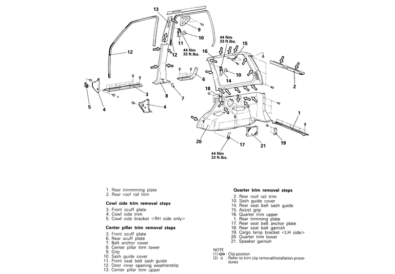 The interior trim panels in Mitsubishi Pick-ups and Monteros are held in place with retaining screws and retaining clips. To remove the retaining clips follow this procedure: