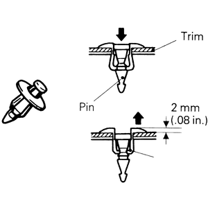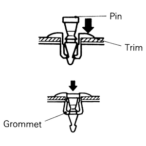 Attach any wires or hoses which were disconnected upon removal. Screw the panel in place and install any of the overlapping panels, which were removed. To install the pin clips into the panels, for this procedure: