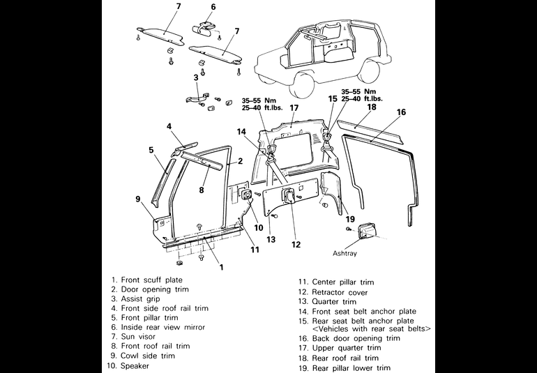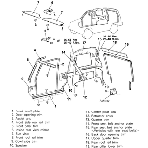 | Fig. 7: Interior trim pieces for 4-door 1983–91 Monteros equipped with sunroofs |