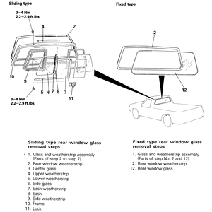 | Fig. 4: Rear window glass removal and installation components — Pick-ups |
