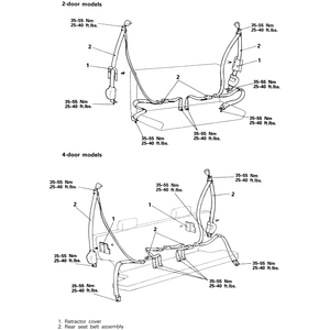 | Fig. 2: Rear seat belt routing on 1990–91 Monteros — other years are similar |
