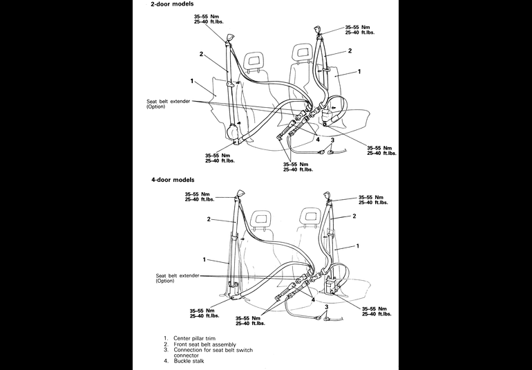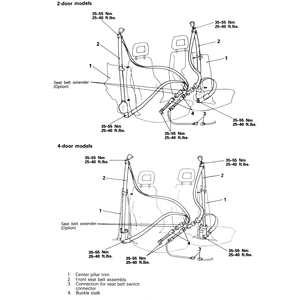 | Fig. 1: Front seat belt routing on 1990–92 Monteros — other years and models are similar |