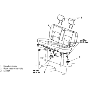 Tighten the seatback to seat retaining bolts to 39 ft. lbs. (52 Nm). On 2-door