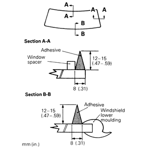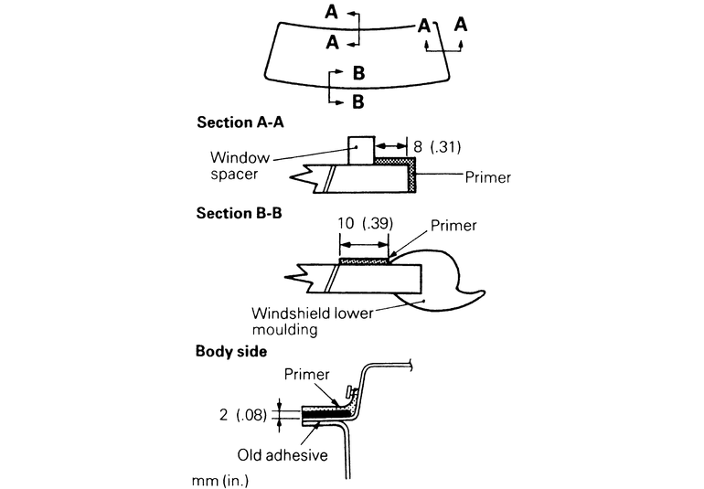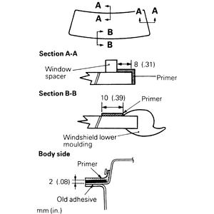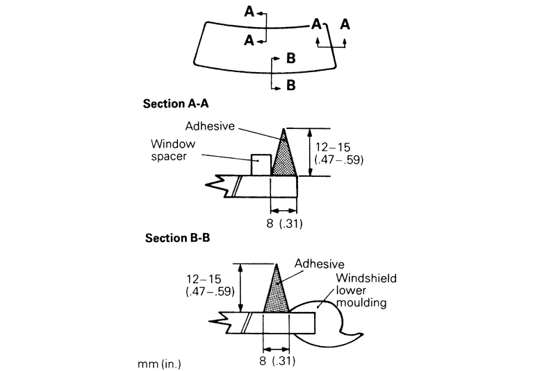 NOTE: Do not move the glass and mouldings after installing them to the body. Place the glass in the previously marked position. Use care not to close the water groove (in the lower corner of the pinch weld flange) with adhesive.