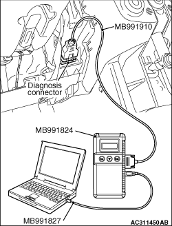 Check again if the diagnosis code is set. (1)Turn the ignition switch to the "ON" position. (2)Erase the diagnosis code. (3)Turn the ignition switch to the "LOCK" (OFF) position. (4)Turn the ignition switch to the "ON" position. (5)Check if the diagnosis code is set. (6)Turn the ignition switch to the "LOCK" (OFF) position. (7)Disconnect M.U.T.-III.