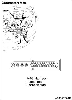 (2)Continuity between ABS-ECU connector A-05 terminal 21 and body earth OK: No continuity (3)Continuity between ABS-ECU connector A-05 terminal 10 and body earth OK: No continuity