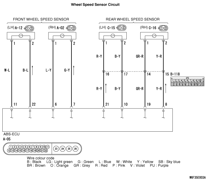 (1)Disconnect the rear left wheel speed sensor connector C-15 and ABS-ECU connector A-05,