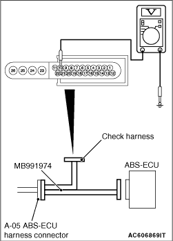 to the ABS-ECU-side connector and harness-side connector, and then measure the voltage at the