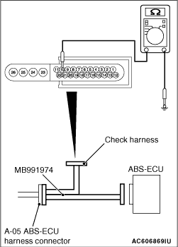 (1)Disconnect the ABS-ECU connector, connect special tool ABS check harness (MB991951)