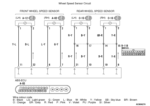 connector failures between ABS-ECU and the wheel speed sensor. For diagnosis procedures, refer