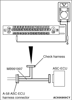 (1)Disconnect the ASC-ECU connector, connect special tool ASC check harness (MB991997) to the harness-side connector, and then measure the resistance at the special tool connector side.