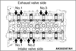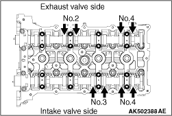 6.Check the valve clearance with the arrow shown in figure in the same procedure as 4. 7.If the valve clearance is deviated from the standard value, remove the camshaft and