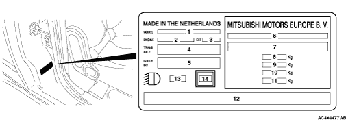 The vehicle identification code label is adhered on the bottom of the centre pillar. The label shows model code, engine model, transmission model, body colour code, chassis number and weight.