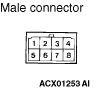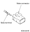 The male and female terminals are indicated as shown. The connector with male terminal(s) is called as male connector and indicated by two connector contour lines, while the connector with female terminal(s) is called as female connector and indicated by single connector contour line.