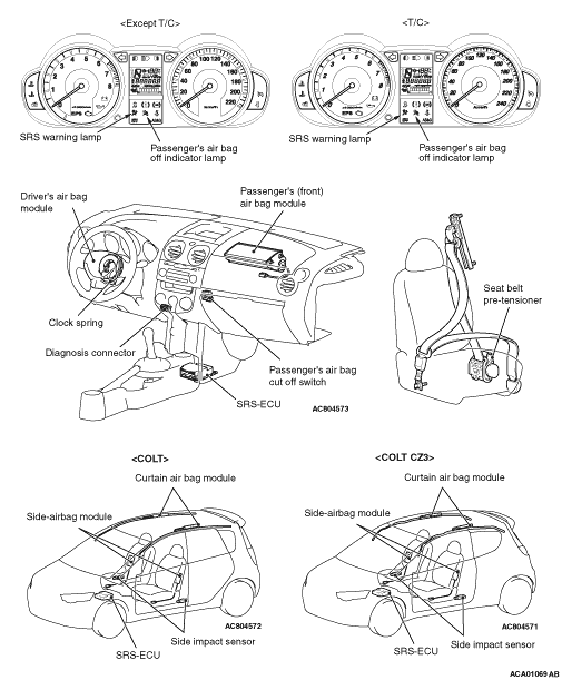 The SRS consists of air bag modules, SRS air bag control unit (SRS-ECU), side impact sensors,