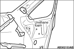 8.Before assembling the new front pillar outer part, attach urethane foam to the area shown in the figure as an alternative to the sound dampening foam material.