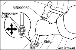 1.If the striker is not engaged with the latch properly, install an temporary bolts instead of the striker mounting bolt, and use the special tool remover bar (MB990939) and a hammer to tap the bolt to the desired direction.