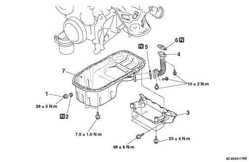 Tighten the engine oil pan mounting bolts to the specified torque. Tightening torque: 7.0 ± 1.0 N·m